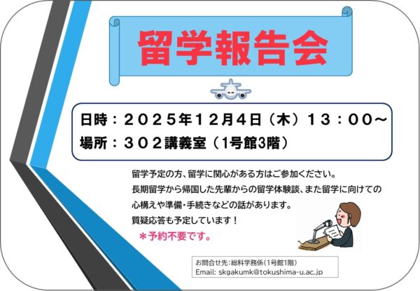 問合せ先:総合科学部学務係(1号館1階) Tel: 088-656-7108 / Email: skgakumk@tokushima-u.ac.jp