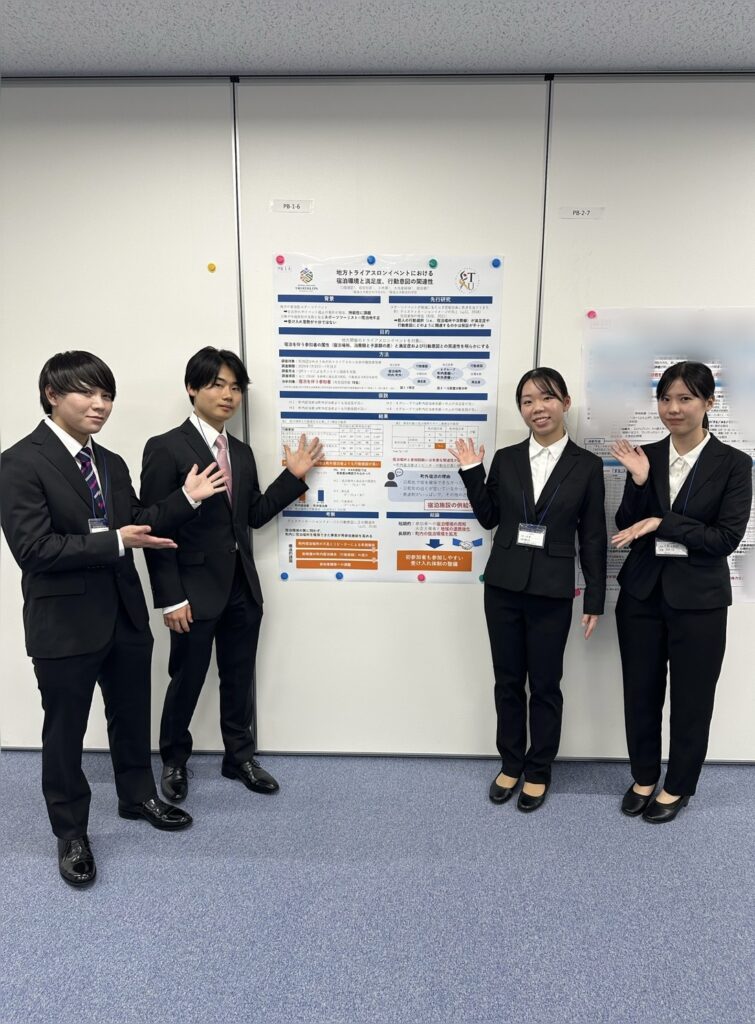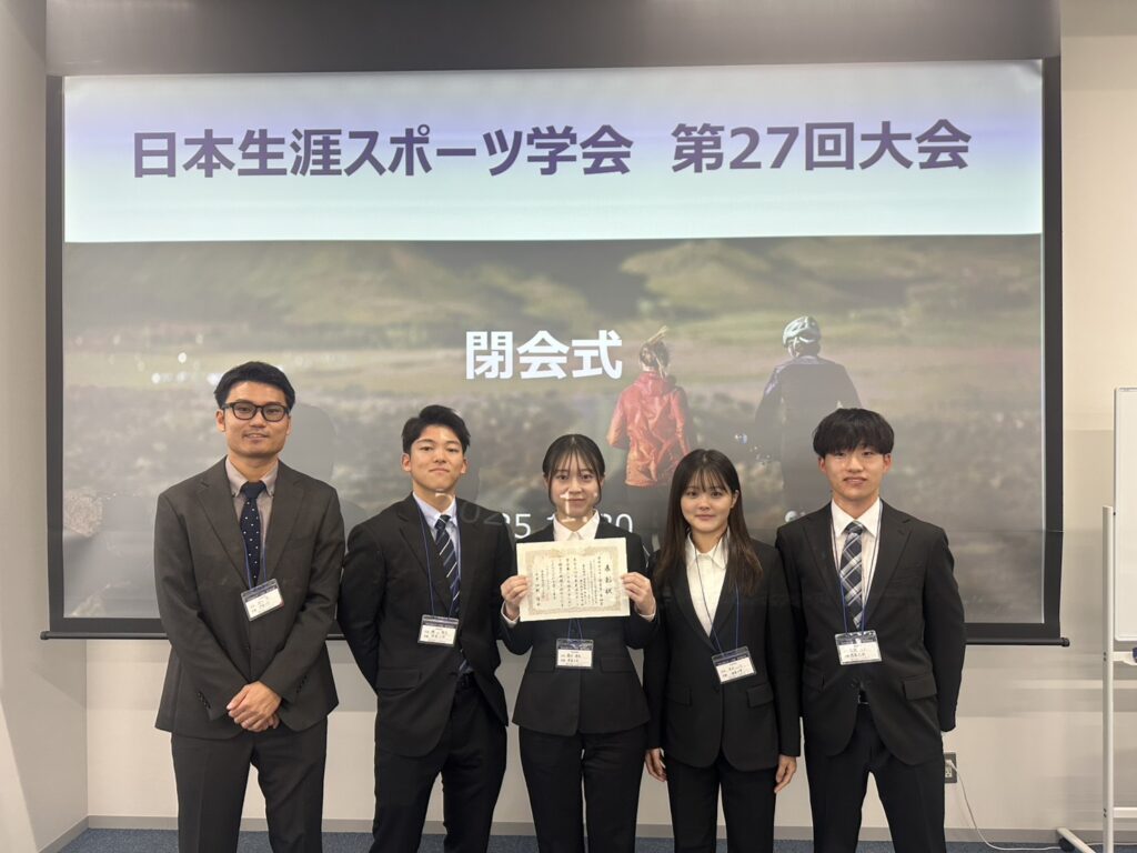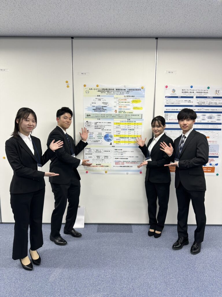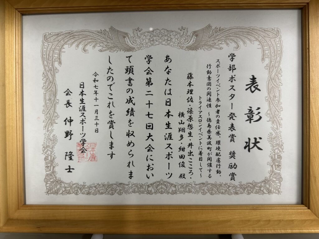 本学部の紺田俊講師のゼミ(スポーツマネジメント)に所属する学部生が令和7年11月29日から30日に開催された日本生涯スポーツ学会第27回大会でポスター発表を行い、学部ポスター発表セッションで奨励賞を受賞しました。今回、紺田ゼミからは「ひわさうみがめトライアスロンの参加者確保」をテーマに2つの研究発表を行い、藤本理佐さんのグループが奨励賞を受賞しました。主な研究結果は、大会参加の経験が開催地域(美波町)への責任感を形成し、自然保全にかかわる環境配慮行動と再参加や再訪問に向けた行動意図を促すことが示唆されました。さらに、参加者の環境配慮行動が高められることで行動意図も強まることが明らかになりました。