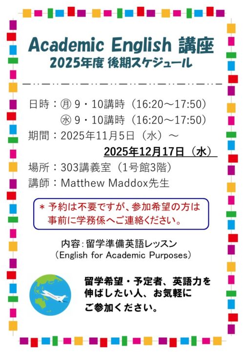 2025年後期に開講中のアカデミック英語講座につきまして、開講期間が以下の通り変更になりましたのでお知らせします。