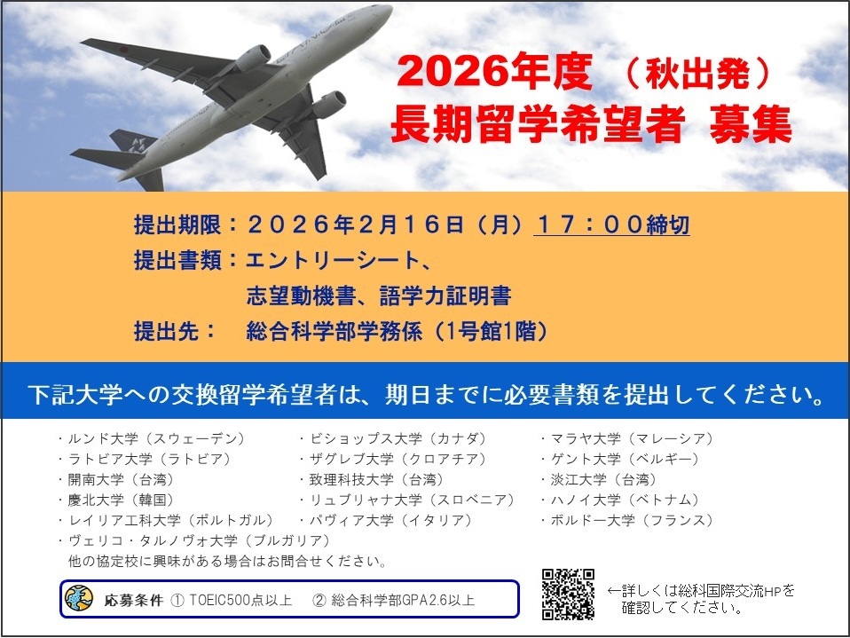 2026年度秋出発の長期交換留学希望者の募集を開始します。